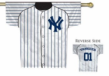 MLB New York Yankees 2-Sided Jersey House Flag are shaped just like your favorite Yankee jersey. Yankee logo on the front with logo name and #01 on the back.